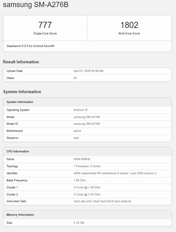 The Samsung Galaxy A27 5G has appeared in Geekbench tests featuring the Snapdragon 6 Gen 3 processor and the Android 16 operating system.