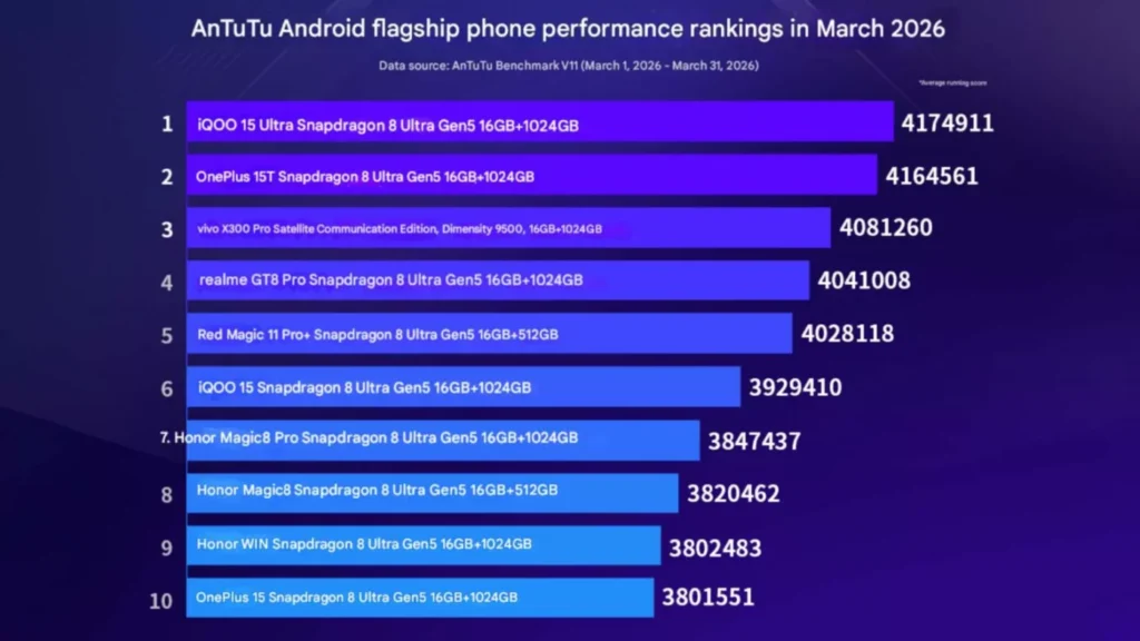 Sitting in the champion’s chair for March is the iQOO 15 Ultra, powered by Qualcomm’s next-generation Snapdragon 8 Elite Gen 5 chipset. The device claimed the top spot in the Android ecosystem with an incredible score of 4,208,894.